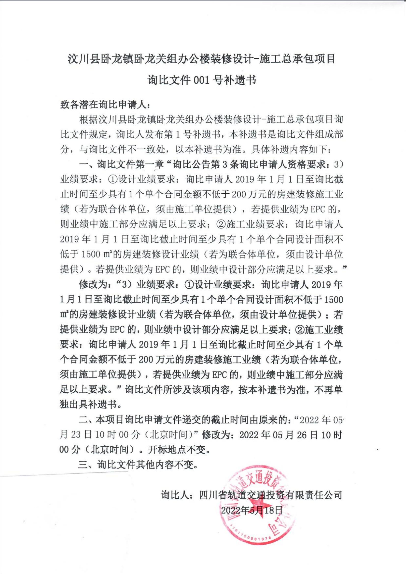 汶川縣臥龍鎮臥龍關組辦公樓裝修設計-施工總承包項目詢比文件001號補遺書
