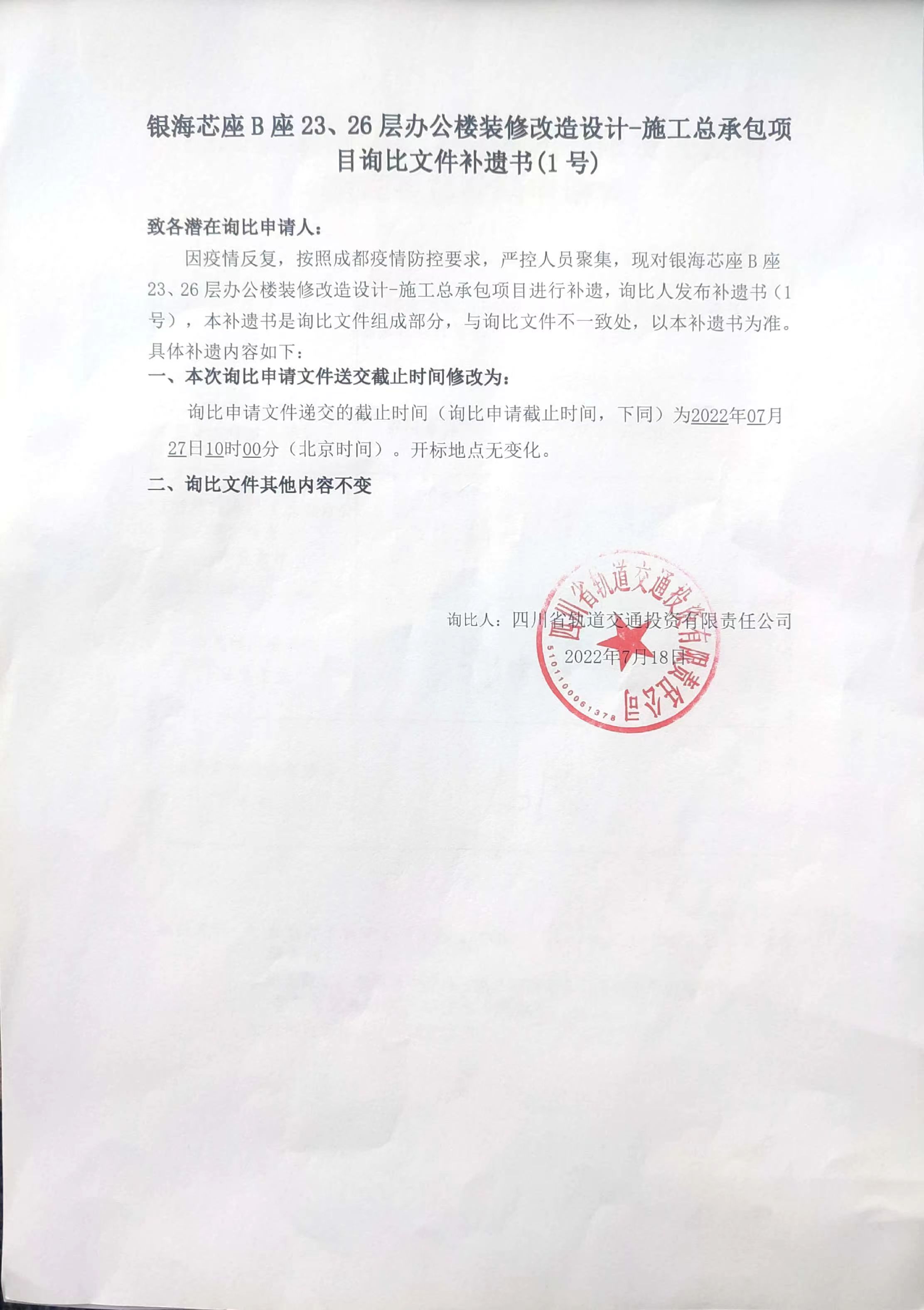 銀海芯座B座23、26層辦公樓裝修改造設計-施工總承包項目詢比文件補遺書(1號)