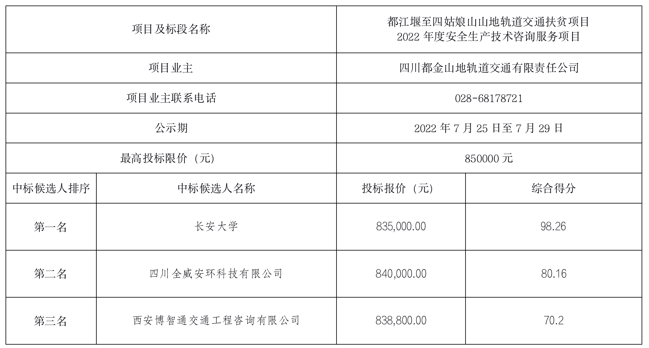 都江堰至四姑娘山山地軌道交通扶貧項目2022年度安全生產技術咨詢服務項目評審結果公示